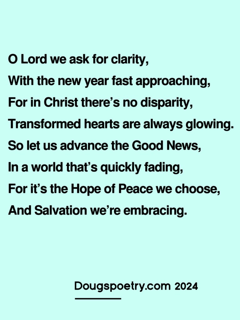 The Hope of Peace Posted bydougspoetryDecember 31, 2024Posted inChristian, Poetry, ReligionTags:Calvary, Christian, Grace, Hope, Jesus, Poem, Poetry, Redemption, Religion Share this: Click to share on Facebook (Opens in new window) Facebook Click to share on X (Opens in new window) X Like Loading... Published by dougspoetry I am an avid poet, writing about life and faith. View more posts