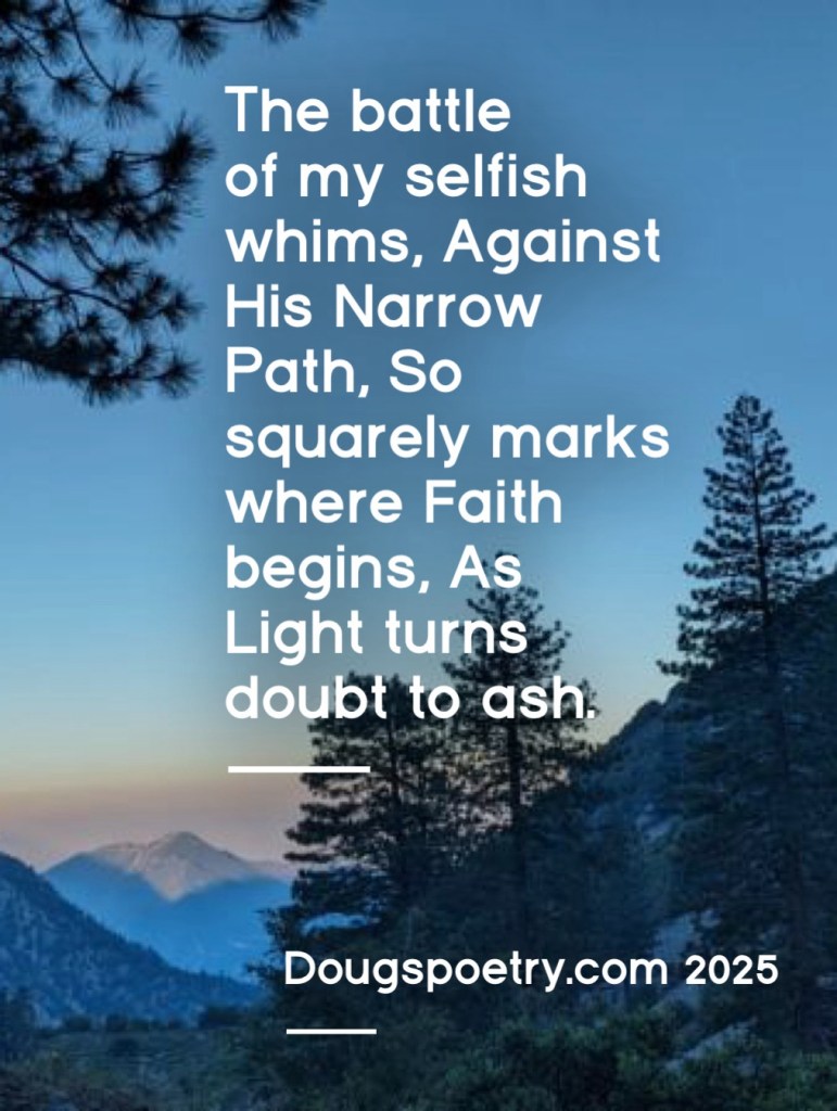 Where Faith Begins Posted bydougspoetryJanuary 25, 2025Posted inChristian, Poetry, ReligionTags:Calvary, Christian, Grace, Hope, Jesus, Poem, Poetry, Redemption, Religion Share this: Click to share on Facebook (Opens in new window) Facebook Click to share on X (Opens in new window) X Like Loading... Published by dougspoetry I am an avid poet, writing about life and faith. View more posts
