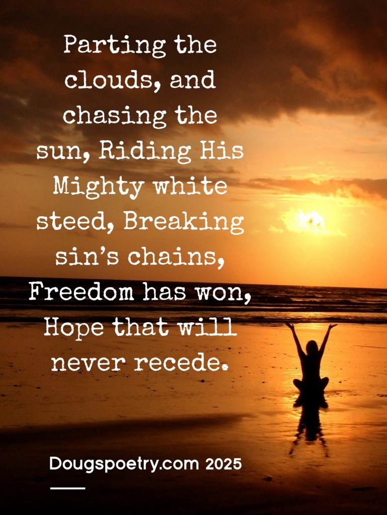Breaking Sin’s Chains Posted bydougspoetryFebruary 4, 2025Posted inChristian, Poetry, ReligionTags:Calvary, Christian, Grace, Hope, Jesus, Poem, Poetry, Redemption, Religion Share this: Click to share on Facebook (Opens in new window) Facebook Click to share on X (Opens in new window) X Like Loading... Published by dougspoetry I am an avid poet, writing about life and faith. View more posts