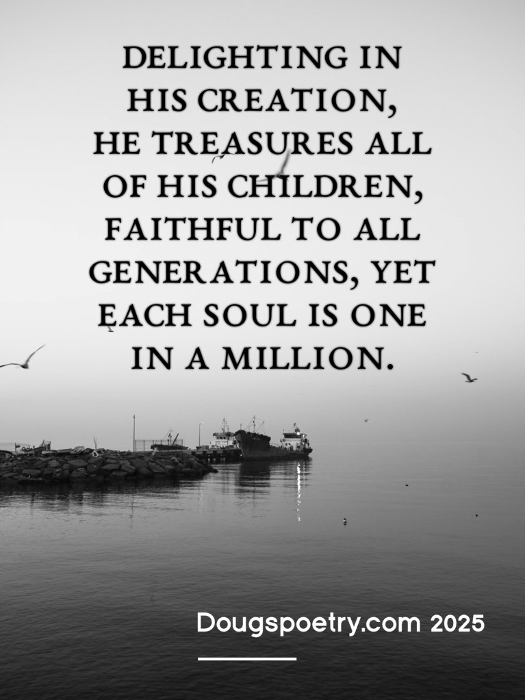 One in a Million Posted bydougspoetryFebruary 16, 2025Posted inChristian, Poetry, ReligionTags:Calvary, Christian, Grace, Hope, Jesus, Poem, Poetry, Redemption, Religion Share this: Click to share on Facebook (Opens in new window) Facebook Click to share on X (Opens in new window) X Like Loading... Published by dougspoetry I am an avid poet, writing about life and faith. View more posts