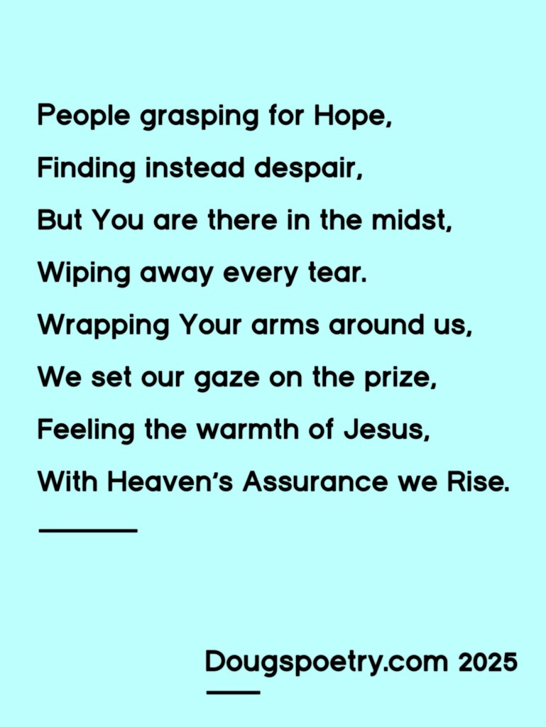 Heaven’s Assurance Posted bydougspoetryFebruary 17, 2025Posted inChristian, Poetry, ReligionTags:Calvary, Christian, Grace, Hope, Jesus, Poem, Poetry, Redemption, Religion Share this: Click to share on Facebook (Opens in new window) Facebook Click to share on X (Opens in new window) X Like Loading... Published by dougspoetry I am an avid poet, writing about life and faith. View more posts