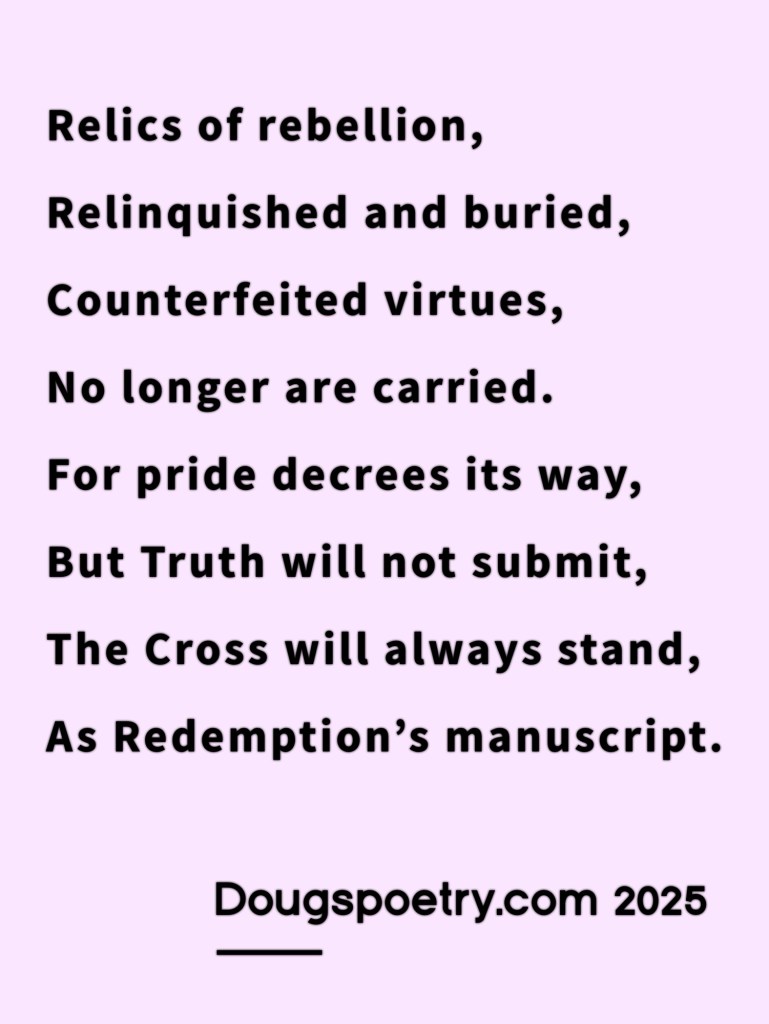 Redemption’s Manuscript Posted bydougspoetryMarch 4, 2025Posted inChristian, Poetry, ReligionTags:Calvary, Christian, Grace, Hope, Jesus, Poem, Poetry, Redemption, Religion Share this: Click to share on Facebook (Opens in new window) Facebook Click to share on X (Opens in new window) X Like Loading... Published by dougspoetry I am an avid poet, writing about life and faith. View more posts