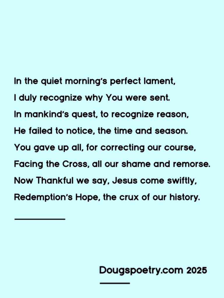 Facing the Cross Posted bydougspoetryMarch 10, 2025Posted inChristian, Poetry, ReligionTags:Calvary, Christian, Grace, Hope, Jesus, Poem, Poetry, Redemption, Religion Share this: Click to share on Facebook (Opens in new window) Facebook Click to share on X (Opens in new window) X Like Loading... Published by dougspoetry I am an avid poet, writing about life and faith. View more posts
