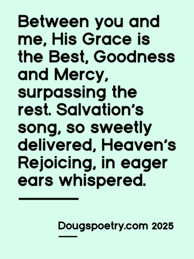 Salvation’s Song Posted bydougspoetryApril 2, 2025Posted inChristian, Poetry, ReligionTags:Calvary, Christian, Grace, Hope, Jesus, Poem, Poetry, Redemption, Religion Share this: Click to share on Facebook (Opens in new window) Facebook Click to share on X (Opens in new window) X Like Loading... Published by dougspoetry I am an avid poet, writing about life and faith. View more posts