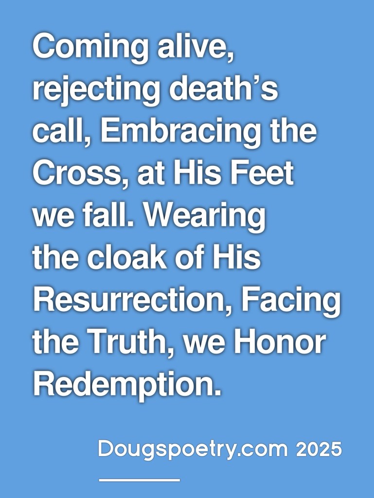 Embracing the Cross Posted bydougspoetryApril 6, 2025Posted inChristian, Poetry, ReligionTags:Calvary, Christian, Grace, Hope, Jesus, Poem, Poetry, Redemption, Religion Share this: Click to share on Facebook (Opens in new window) Facebook Click to share on X (Opens in new window) X Like Loading... Published by dougspoetry I am an avid poet, writing about life and faith. View more posts