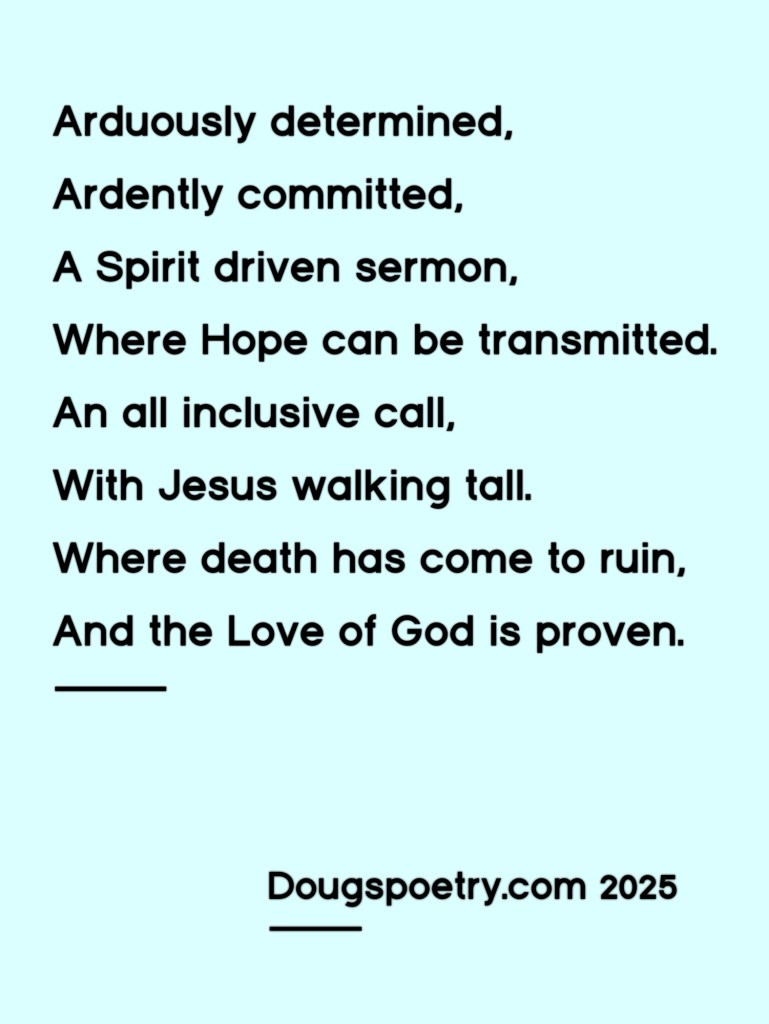 Spirit Driven Posted bydougspoetryApril 8, 2025Posted inChristian, Poetry, ReligionTags:Calvary, Christian, Grace, Hope, Jesus, Poem, Poetry, Redemption, Religion Share this: Click to share on Facebook (Opens in new window) Facebook Click to share on X (Opens in new window) X Like Loading... Published by dougspoetry I am an avid poet, writing about life and faith. View more posts