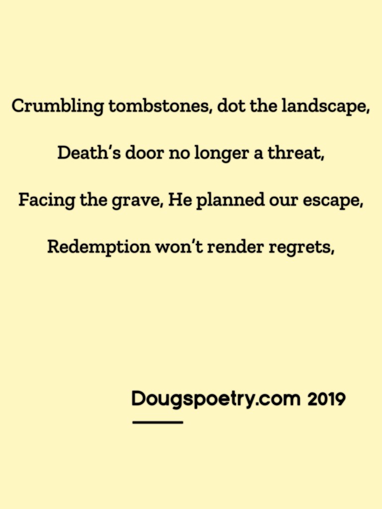 Facing the Grave Posted bydougspoetryOctober 19, 2025Posted inChristian, Poetry, ReligionTags:Calvary, Christian, Grace, Hope, Jesus, Poem, Poetry, Redemption, Religion Share this: Click to share on Facebook (Opens in new window) Facebook Click to share on X (Opens in new window) X Like Loading... Published by dougspoetry I am an avid poet, writing about life and faith. View more posts