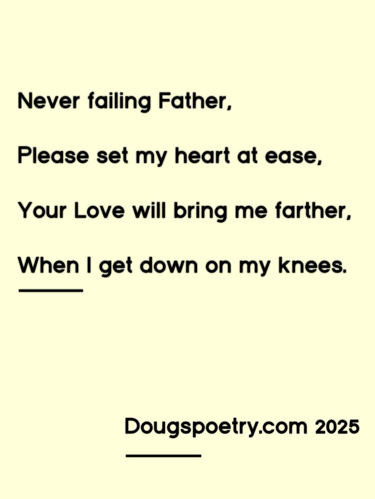 On My Knees Posted bydougspoetryOctober 30, 2025Posted inChristian, Poetry, ReligionTags:Calvary, Christian, Grace, Hope, Jesus, Poem, Poetry, Redemption, Religion Share this: Click to share on Facebook (Opens in new window) Facebook Click to share on X (Opens in new window) X Like Loading... Published by dougspoetry I am an avid poet, writing about life and faith. View more posts