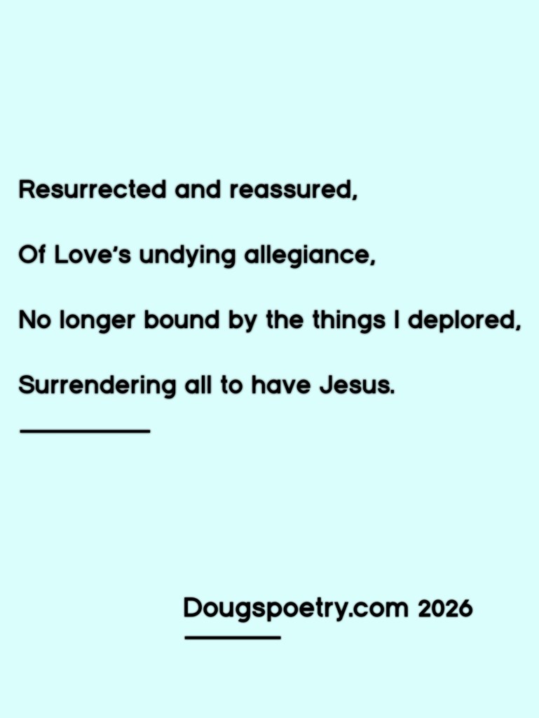 Surrendering All Posted bydougspoetryMarch 27, 2026Posted inChristian, Poetry, ReligionTags:Calvary, Christian, Grace, Hope, Jesus, Poem, Poetry, Redemption, Religion Share this: Share on Facebook (Opens in new window) Facebook Share on X (Opens in new window) X Like Loading... Published by dougspoetry I am an avid poet, writing about life and faith. View more posts
