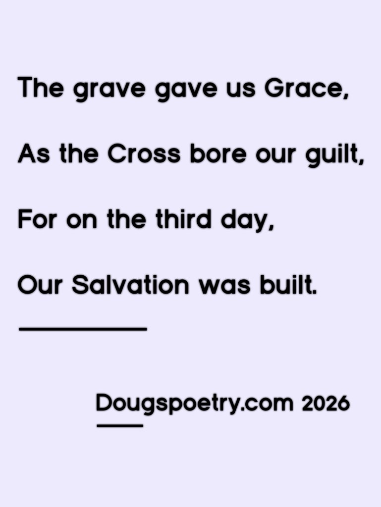Our Salvation Posted bydougspoetryMarch 31, 2026Posted inChristian, Poetry, ReligionTags:Calvary, Christian, Grace, Hope, Jesus, Poem, Poetry, Redemption, Religion Share this: Share on Facebook (Opens in new window) Facebook Share on X (Opens in new window) X Like Loading... Published by dougspoetry I am an avid poet, writing about life and faith. View more posts