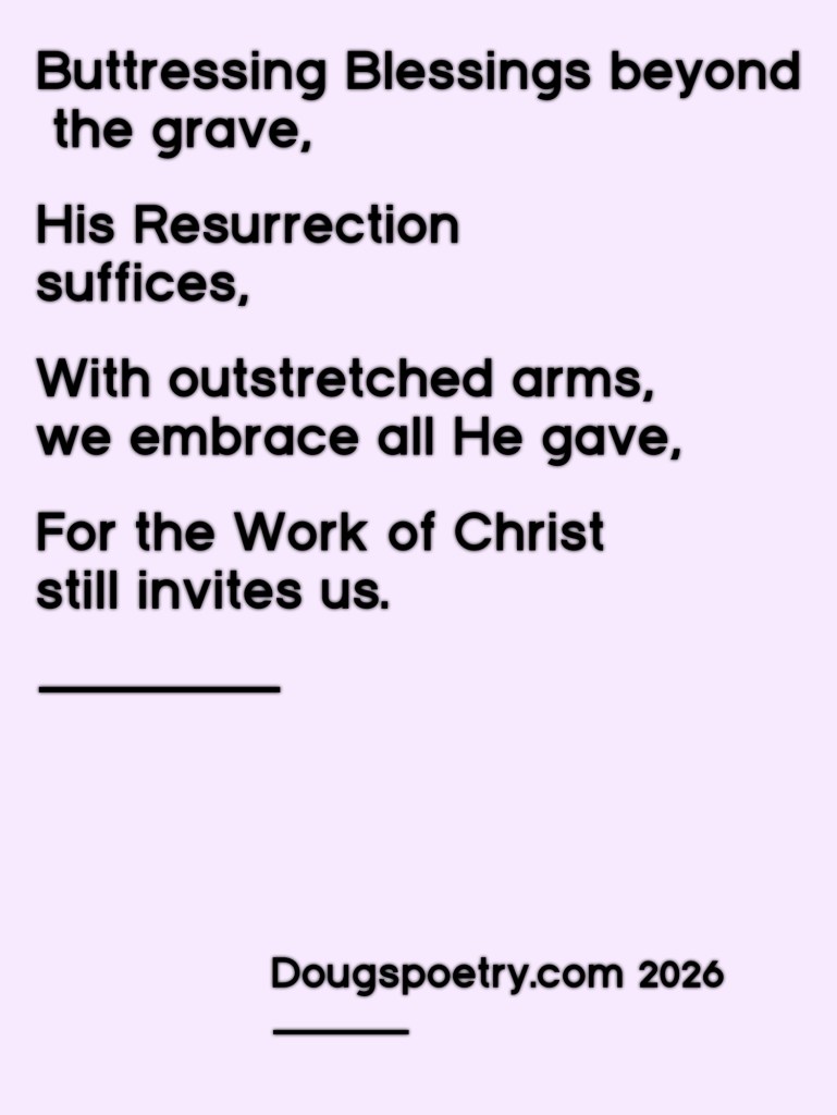 Outstretched Arms Posted bydougspoetryApril 2, 2026Posted inChristian, Poetry, ReligionTags:Calvary, Christian, Grace, Hope, Jesus, Poem, Poetry, Redemption, Religion Share this: Share on Facebook (Opens in new window) Facebook Share on X (Opens in new window) X Like Loading... Published by dougspoetry I am an avid poet, writing about life and faith. View more posts