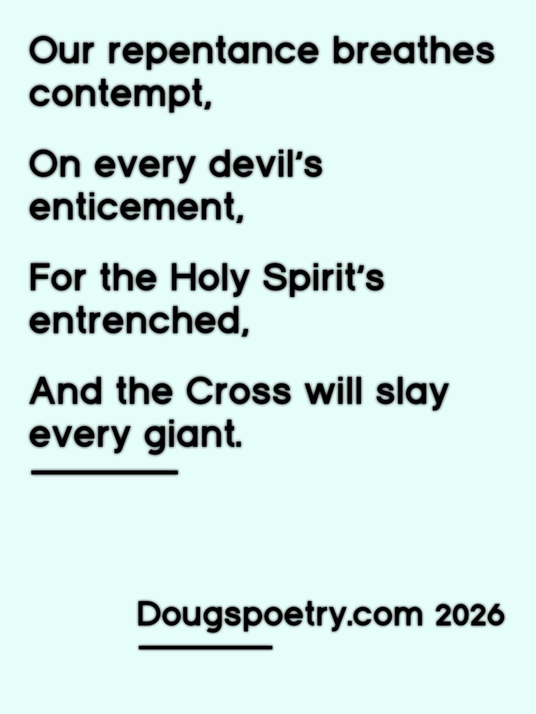 Every Giant Posted bydougspoetryApril 18, 2026Posted inChristian, Poetry, ReligionTags:Calvary, Christian, Grace, Hope, Jesus, Poem, Poetry, Redemption, Religion Share this: Share on Facebook (Opens in new window) Facebook Share on X (Opens in new window) X Like Loading... Published by dougspoetry I am an avid poet, writing about life and faith. View more posts